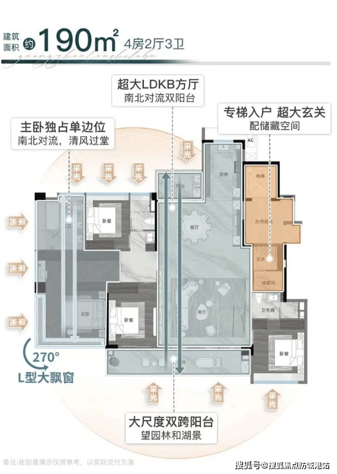 生活场景:南向的超大阳台,可以是你的私人花园,种满花草;北向的生活阳台,则是洗衣晾晒的实用空间。LDKG一体化的大方厅,足以容纳十几人的家庭聚会。