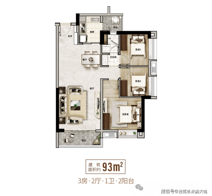 第一种户型:建面约93-95㎡三房两厅一卫,刚需入门首选户型