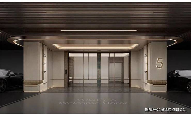 当你开车驶入车库那一刻,映入眼帘的便是顶部古铜色云系的定制铝格栅,两侧白玉兰岩板与精致的不锈钢构件相结合,坡道的马蹄石材映衬搭配灯光智能指引系统,氛围感与仪式感瞬间拉满。