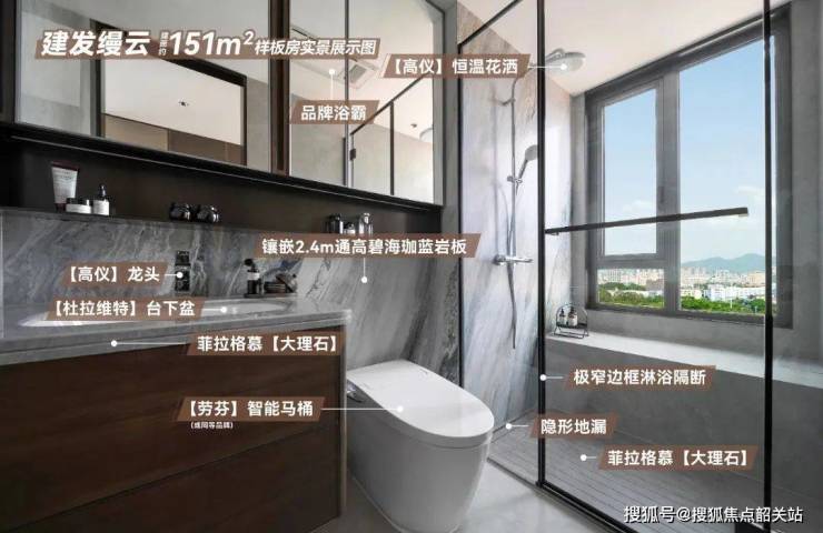 建发缦云深谙其道,更是以实际的行动来践行自己的承诺,在原装标含全屋大金空调、百朗新风系统、博世厨具三件套 (灶台、抽油烟机和洗碗机)、卫生间全配德系高端卫浴品牌(杜拉维特台盆、瑞士劳芬一体智能马桶和高仪的龙头花洒......)等本就足够顶流的标准下,又增投数千万,用于项目装标的提升:卫生间洗手台面的雪山蓝奢石、墙面的雪山蓝岩板、且主卧卫生间中增加了美妆冰箱。