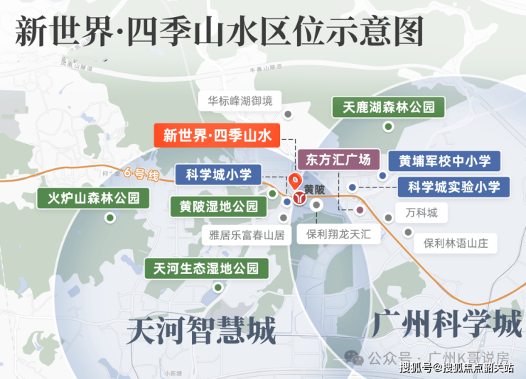 项目位于黄埔区黄陂板块,恰好处于天河智慧城与广州科学城两大产业核心的交汇处,占据了区域发展的核心位置。科学城作为广州东部科创产业的核心承载区,目前已聚集超 2500 家高新技术企业,累计培育上市企业 83 家,数量位居国家级经济技术开发区首位,同时还汇聚了 202 家专精特新 “小巨人” 企业,产业能级处于区域领先水平。天河智慧城则依托天河区的产业基础,聚集了大量数字经济、人工智能领域的科技企业,两大板块形成了协同发展的产业格局,为区域带来了稳定的高知人口流入。根据区域统计数据,近三年该板块的常住人口年均增长超过 3%,住房需求持续稳定释放。项目所处的位置,既可以承接科学城的产业人口外溢,也能够享受天河智慧城的配套辐射,同时距离天河核心区的直线距离仅约 12 公里,可快速承接天河的外溢需求。从区域房价来看,近三年该板块的二手房均价保持在 4.2 万 - 4.8 万 /㎡的区间,而项目的在售均价处于 3.1 万 - 4.58 万 /㎡的区间,价格具备一定的优势,同时随着板块旧改的推进,区域的城市面貌和配套还将进一步升级,位置的价值还将持续释放。