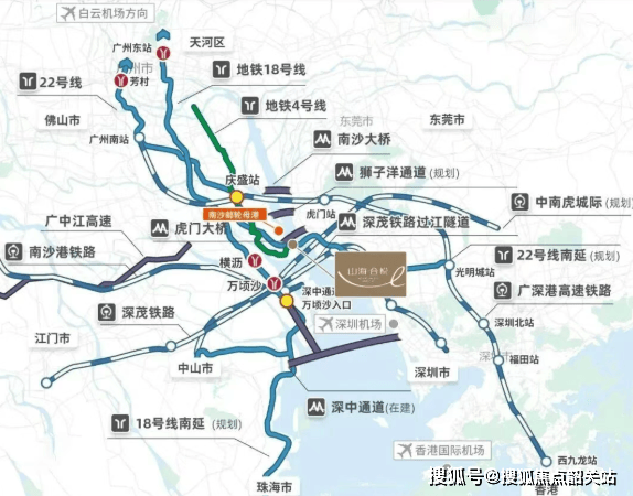 地段,始终是房产价值的第一逻辑。山海合悦坐拥南沙湾黄金腹地,距地铁4号线、15号线(规划中)与22号线三线交汇的南沙客运港站仅约900米,步行即可抵达。其中,22号线作为湾区“大动脉”,设计时速高达160公里,首通段已开通运营,未来30分钟内可直达广州中心城区;更令人瞩目的是,仅2站即可换乘深圳地铁,真正实现广深“双城生活”。