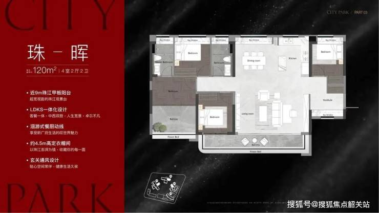 🏡 项目主力户型为 120-140㎡四房,全现楼交付,户户朝南,3 栋(社区 C 位)享最佳江景视野。120㎡四房两厅两卫,使用率约 96%,客厅开间约 4.2 米,超宽阳台(面宽约 6 米)连接次卧,主卧带 L 型转角飘窗(270° 望江),适配改善家庭;140㎡四房两厅两卫,使用率约 100%,LDK 一体化设计(客餐厅面积超 40㎡),双阳台 + 多飘窗,主卧套间带独立衣帽间,部分户型观江面超 10 米,满足高阶改善需求。