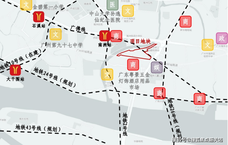 项目地处海珠区南洲路与东晓南路交汇区域,属典型的老城区成熟板块。除地铁南洲站(2号线/广佛线)外,周边1公里内设有多个公交站点,覆盖通往天河、越秀、番禺的主要线路。早高峰时段,驾车经广州大道南或环城高速进入珠江新城,平均耗时约25分钟;打车至琶洲会展中心约15分钟。