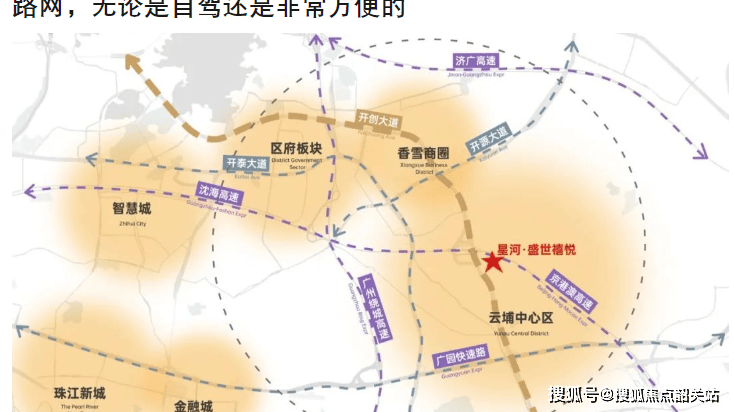 目前云埔板块虽暂无地铁,但项目紧挨科学城黄金动脉开创大道,北行 5 公里直达科学城香雪地铁站,南走接驳广源可达金融城、珠江新城。三横四纵十公交的立体式交通路网,无论是自驾还是公交出行,都十分便捷。