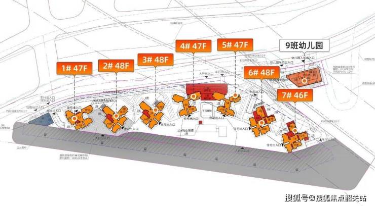 楼栋布局上,7栋楼一字排开,均为46 - 48层超高层,每栋楼独立设置,未采用“双拼”结构,消灭尴尬“中间户”,有效避免暗房,提升采光与通风体验。且每栋楼仅朝南设置房屋,并微微偏转一定角度,既保证合适隐私距离,又让户户朝南的空间能欣赏到不同风景。