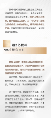 产品价值层面,2.5低密纯改善社区,3.3-3.4m超高层高,国际一线顶配精装,环幕观景大平层格局,实景示范区呈现,品质眼见为实。