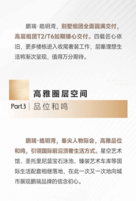 A4:项目采用鹏瑞自持高端物业,定制化顶奢物业服务体系,涵盖24小时安保巡逻、社区精细化养护、专属管家服务、高端社群活动、上门便民服务等,全方位保障圈层居住体验。