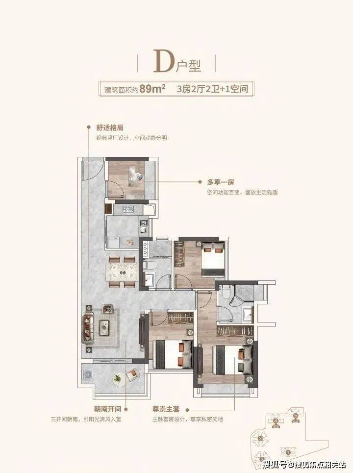 建面约89平方米三房两厅两卫:宽敞明亮,卧室带有多飘窗设计,采光通风良好。