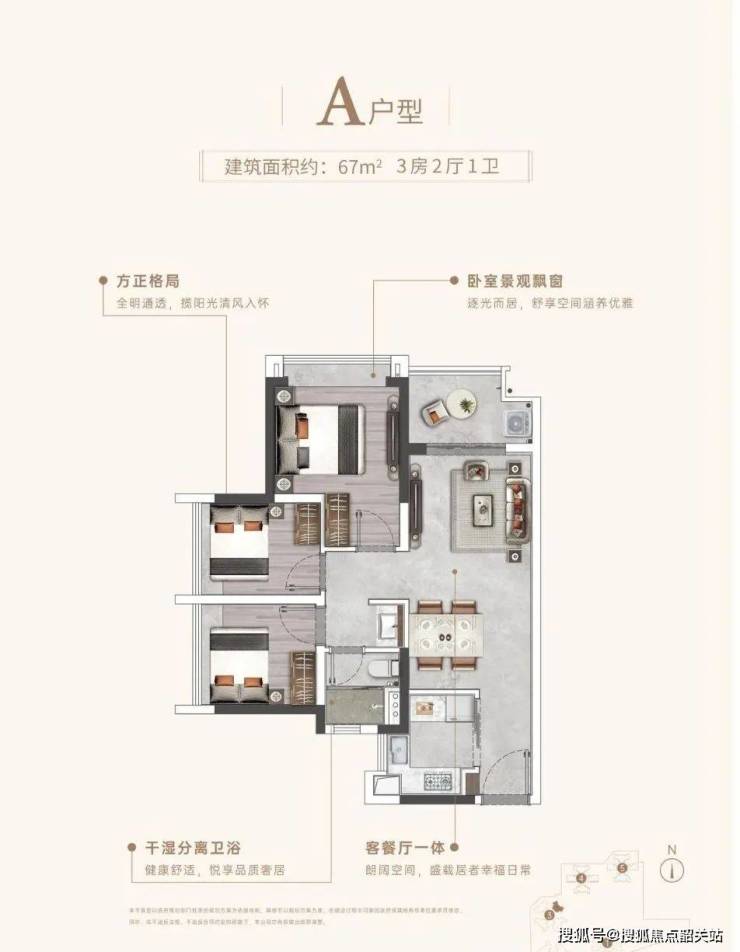 建面约67平方米三房两厅一卫:紧凑实用的设计,适合首次置业的年轻人。