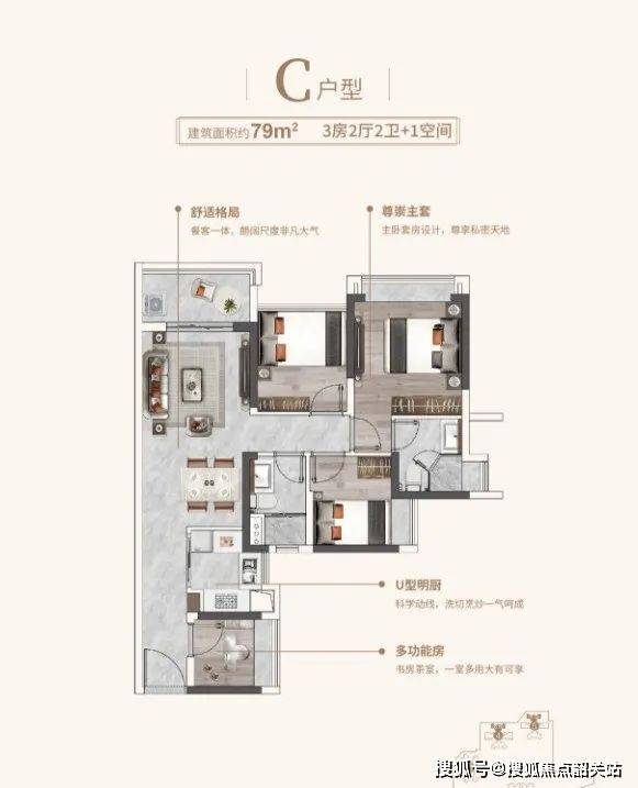 建面约79平方米四房两厅两卫:科学动线设计,主卧套房布局,适合追求更大空间的家庭。
