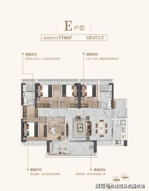 建面约114平方米三房两厅两卫:LDK一体化设计,四开间朝南,配备巨幕宽景阳台,适合大家庭或追求高品质生活的购房者。