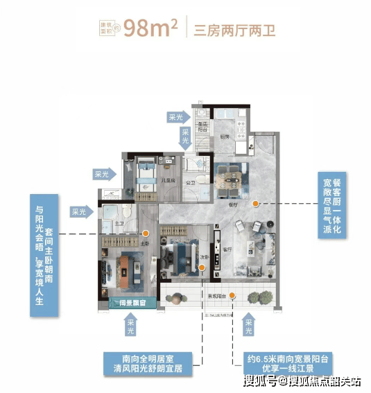 华丰·金湾的产品力,体现在对空间极致的尊重与打磨。项目仅规划5栋住宅,主打建面约98-143㎡三至四房,全部采用纯板式结构、两梯四户、户户朝南设计,杜绝“暗房”与“西晒”痛点。以热销的115㎡四房为例,做到6.5米南向观景阳台+南北通透横厅+主卧套房+双卫配置,得房率超82%。所有户型均方正实用,无多余拐角,动线流畅如教科书级别。更罕见的是,项目通过整体抬高1.5米地基,不仅提升防洪等级,更让低楼层也能享受开阔视野与良好通风。这种“牺牲容积率换舒适度”的做法,在当下高周转市场中极为稀缺,彰显开发商对产品主义的坚守。