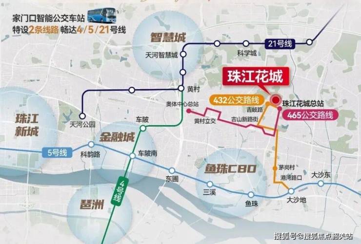 尽管珠江花城的交通曾被诟病出行道路窄且离地铁远,但随着项目的推进和周边基础设施的完善,交通状况正在逐步改善。小区设有公交车总站,提供4条公交线路,其中465路无缝接驳地铁4号线和21号线黄村站,432路直达地铁5号线大沙地站,方便居民出行至鱼珠CBD和珠金琶CBD等地。此外,项目距离地铁7号线姬堂站直线距离仅1.3公里,未来规划中的19号线也将进一步提升交通便利性。
