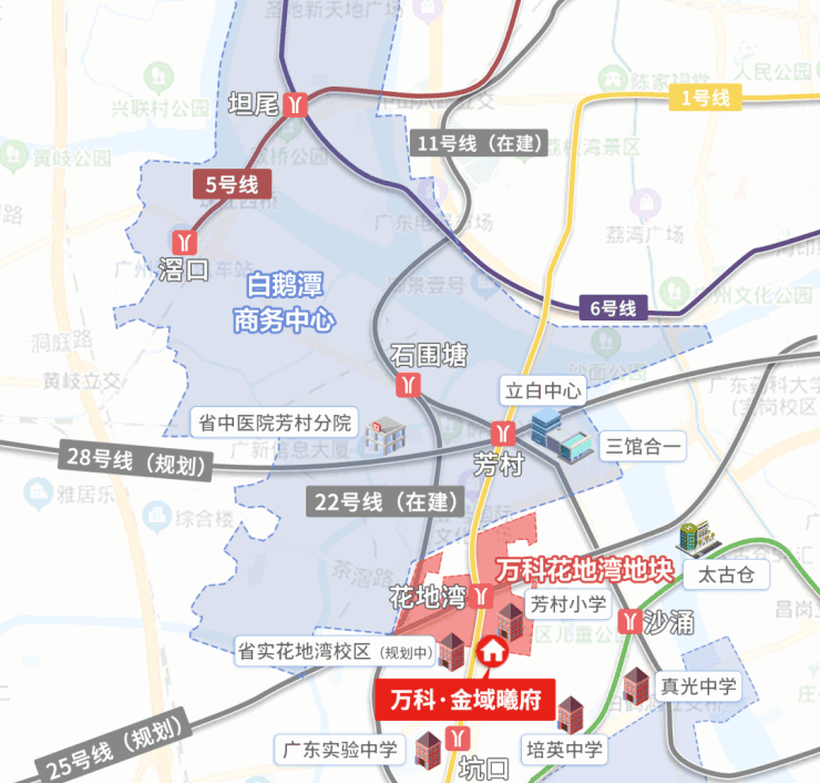 便捷的交通网络:万科金域曦府距离1号线花地湾站、坑口站仅约600米,且未来将有多条地铁线路(如22号线、11号线、28号线及25号线)经过此地,极大地提高了出行的便利性。无论是通勤上班还是周末出游,都能轻松抵达目的地。