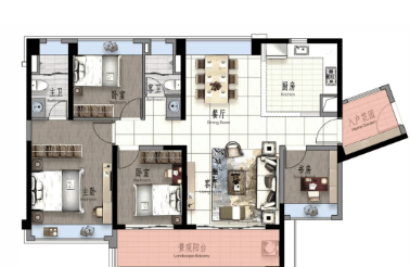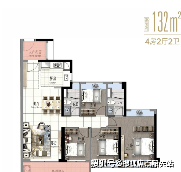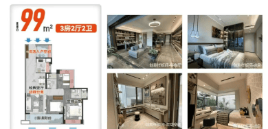 高层产品中,84㎡2+1房、98㎡3房、99㎡3+1房、132㎡与142㎡四房产品,均强调南向采光与空间利用率。多款户型配备约6米以上景观阳台,部分户型拥有入户花园或270°飘窗设计,提升居住舒适度与景观体验。