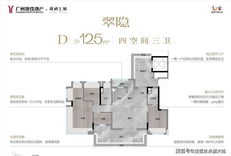 建面约125㎡,更是四房带双主套的板楼户型,拥有比肩豪宅的居住品质。