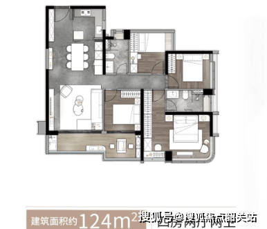 124平方米四房两厅两卫(江幕·辰汐):270°环幕视野,5开间南向望江,畅享约20米拥江景观线。