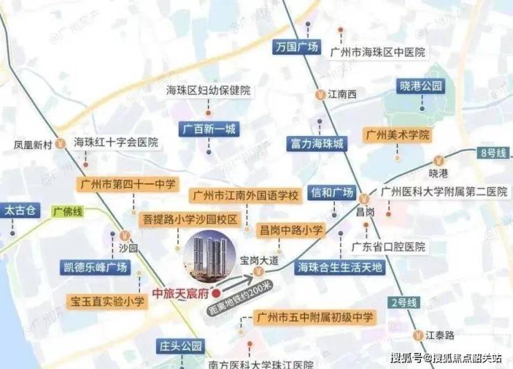 中旅天宸府地理位置优越位于海珠区西部核心发展带交通网络发达。项目距离地铁八号线宝岗大道站c出口直线距离约一百五十米步行可达实现真正意义上的地铁上盖出行体验。通过地铁八号线可快速到达琶洲越秀海珠广场北京路商圈珠江新城等核心区域四站到越秀七站到珠江新城满足日常通勤需求。八号线还可接驳广佛线快速前往荔湾佛山等区域拓展生活半径。道路交通方面项目临近宝岗大道与昌岗西路等城市主干道可快速接入内环路及环城高速自驾出行便捷。周边还有多个公交站点覆盖主要出行方向满足不同人群的交通需求。项目距离内环路入口约一点五公里十五分钟车程内可到达广州南站白云机场等重要交通枢纽。综合来看项目兼具地铁通勤优势与主干道出行便利性对于在珠江新城琶洲或金融城工作的购房者而言具备极强的交通吸引力同时享有城市核心区位价值。