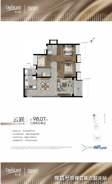 凯德·双桥新作规划了三栋住宅,共411套精品住宅,户型涵盖74-128平方米的二至四房,满足不同家庭结构的需求。社区内部打造了层次丰富的园林景观,并配置了全龄活动空间和全新概念的空中跑道,为居民提供多样化的休闲娱乐选择。此外,社区自带临街商铺,能够满足业主的日常生活需求。