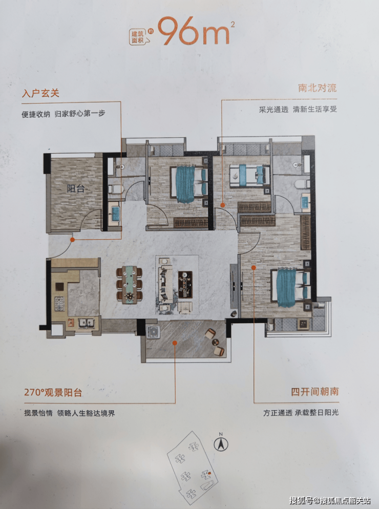 建面约96平、105平两个户型,布局也是类似的,均为横厅设计、南北对流户型,同样的,全屋带有飘窗设计,主卧也为L型飘窗。