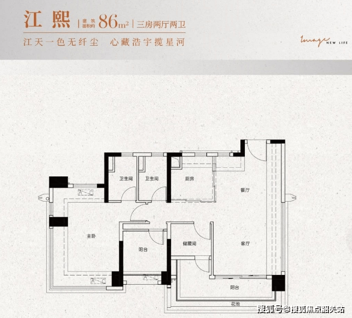 建面约86㎡:三房两厅两卫设计,南向观景大阳台,全屋动静分离,主卧带270°飘窗。