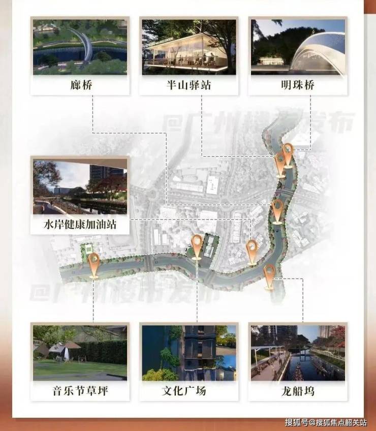 珠江涌在项目内部如玉带环腰般穿行而过,形成了约 1.2 公里的活力水岸,集观光、休闲、运动于一体。