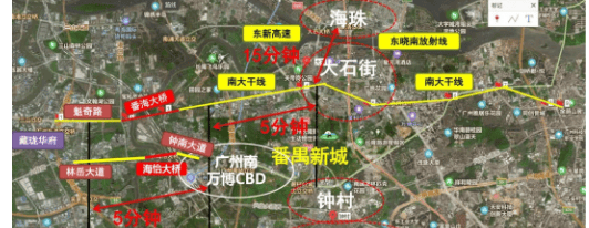 大桥方面,项目周边有四座大桥接驳广州,其中海怡大桥、海华大桥、番海大桥已通车,海浦大桥(规划中)正在推进。海怡大桥一桥到达广州南站,海华大桥(佛陈路接双涌路)、番海大桥(三龙湾大道接南大干线)通车后,业主驾车可快速畅游广佛两城,进一步缩短广佛双城的通行时间;海浦大桥(长江路接南浦大道,规划中)建成后,将直达广州番禺,进一步完善交通路网,提升项目的交通优势。
