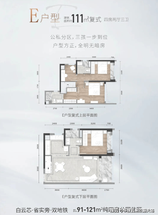 复式四房(111㎡):买一层得两层,实得约140㎡;6.8米挑高客厅,南北双阳台;动静分层设计。