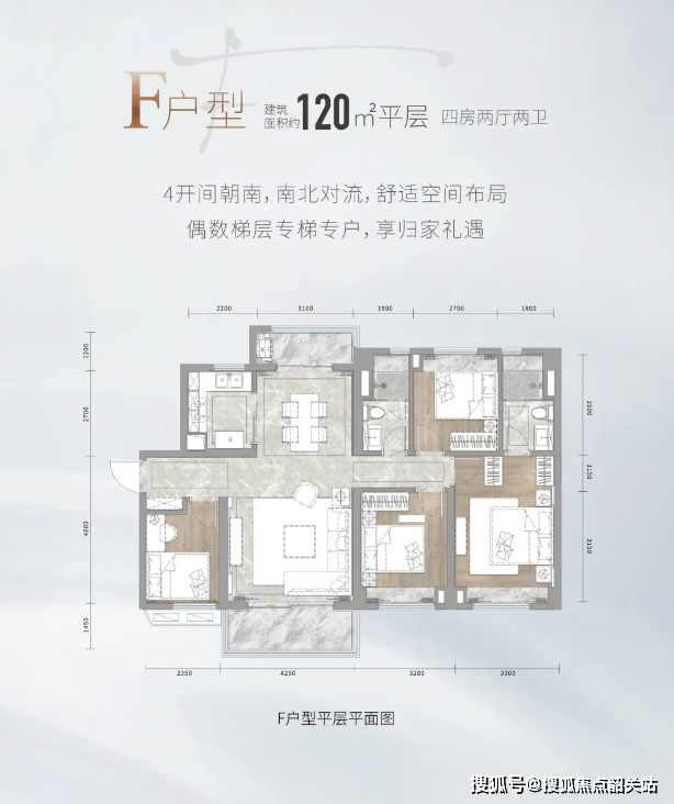 平层四房(120㎡):270°环幕瞰湖视野;四开间朝南,全明户型;双套房设计。