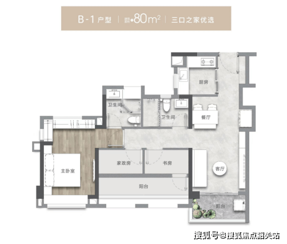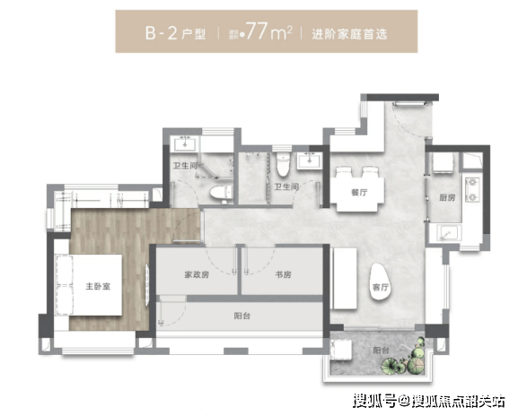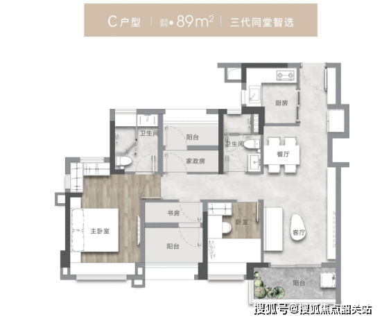 高效户型设计:户型得房率高,达95%,比同等面积多两个空间。