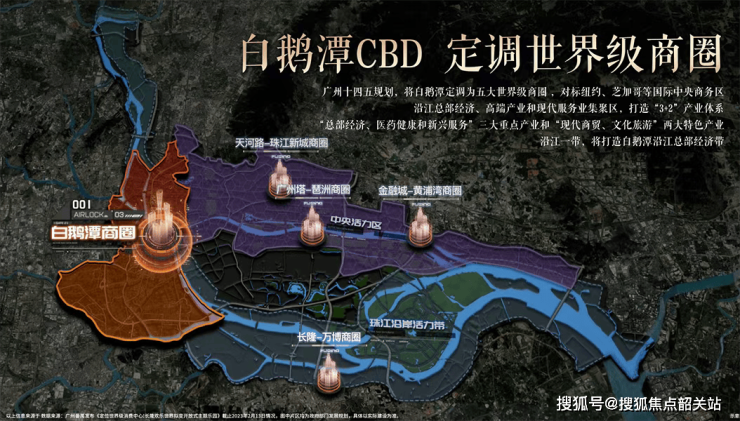 白鹅潭片区已被明确纳入广州“十四五”重点发展区域,定位为粤港澳大湾区滨水CBD。政府投入超千亿资金进行基础设施与产业导入,目前已形成“3+2”产业体系: