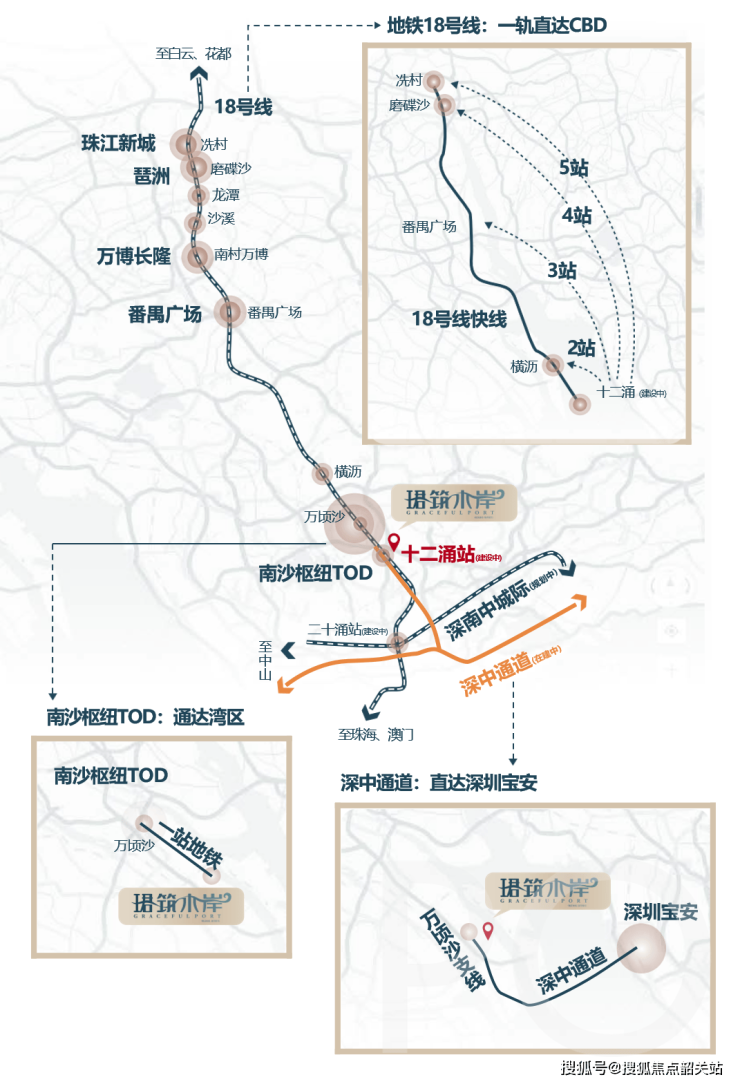 交通条件极为优越,紧邻深中通道广州出入口,仅 2 公里之遥,快速连接深圳前海,实现与深圳的高效互通,且房价相对前海具有显著优势。距离广州地铁 18 号线十二涌站约 1.2 公里,18 号线南延段广州段预计 2025 年正式通车,届时 2 站可达番禺广场,5 站即达珠江新城 CBD 。此外,周边还规划有湾区首条时速 160km/h 的地下轨道交通,未来将实现广州、中山、珠海一线互通,构建起全方位、多层次的交通网络,极大缩短城市间的时空距离,为居民的出行、商务活动及旅游提供极大便利。