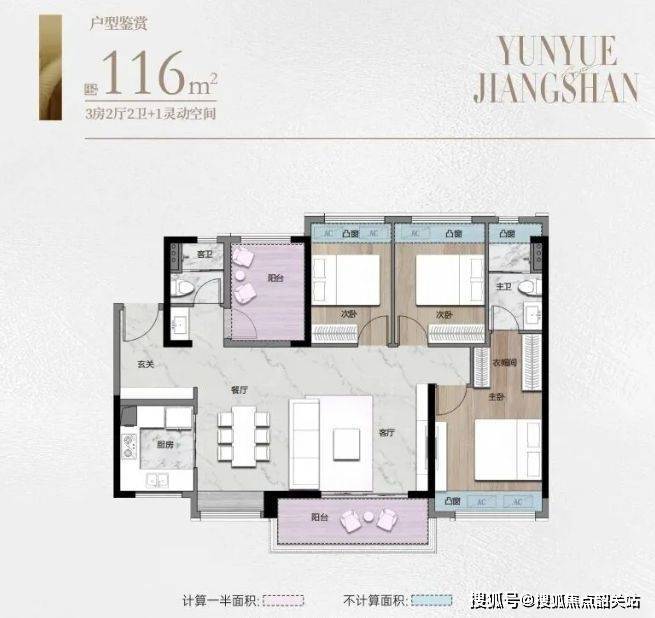 117㎡南北对流双阳台四房:该户型的亮点在于南北对流和双阳台设计。片区内少见的南北对流布局,使空气在室内形成自然流通,清风入室,保持室内空气清新。双阳台设计,一个用于晾晒衣物,另一个可打造为休闲空间,摆放桌椅,享受户外时光。一线朝南的设计,让客厅和卧室都能充分享受阳光。约 6.9 米横厅设计,增加空间开阔感,适合家庭聚会和休闲娱乐。四房设计满足家庭多样化居住需求,各房间尺度适宜,可根据家庭实际情况灵活布置。主卧空间宽敞,配备独立卫生间,提升居住品质。整体户型设计注重通风采光与空间利用,为家庭提供舒适、健康的居住环境。