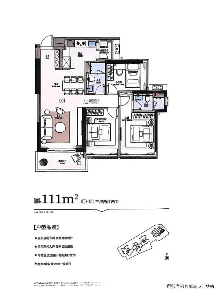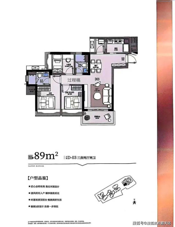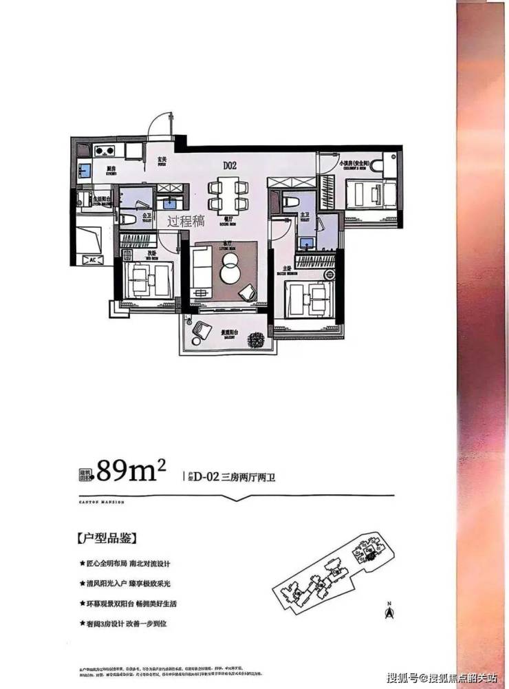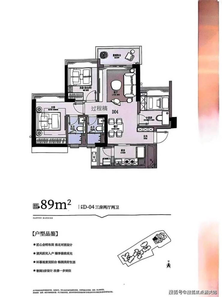 D栋产品:新近加推,面积段为87、90、107平方米,三梯六户设计,其中87平方米户型为南向三房,总价约为400万元左右。