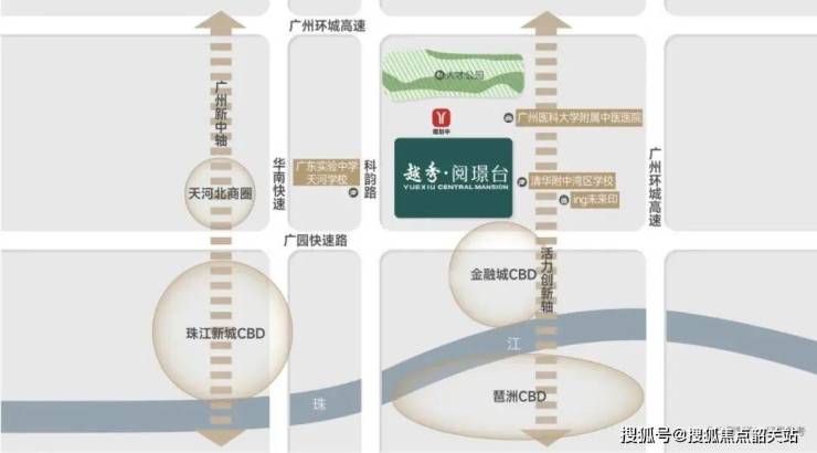 如果说低密是越秀阅璟台的“面子”,那么其占据的战略地段则是它的“里子”。项目坐落于天河广氮板块,这里并非普通的边缘地带,而是国际金融城、天河智慧城与五山创新策源区三大高能级板块的交汇处。这种地理位置的独特性,赋予了项目极强的辐射能力和升值潜力。
