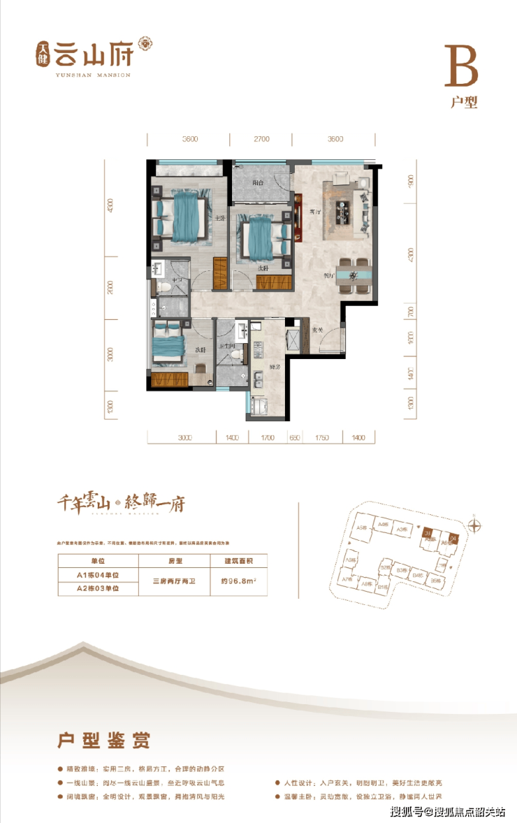 B户型(96.8㎡ 3房2厅2卫):紧凑实用,动静分区,适合三口之家,总价约643万起。