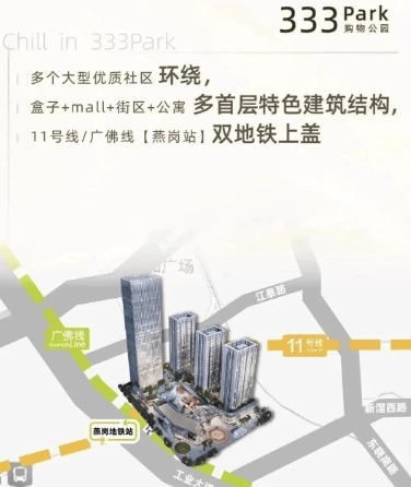 项目坐拥海珠西部五大成熟商圈——太古仓、江南西、东晓南、中大、琶洲,辐射乐峰广场、广百新一城、万科里、燕汇广场、万达广场等大型购物中心。尤为关键的是,项目自身规划的3.8万平方米“333Park”开放式公园商业Mall,将填补燕岗片区大型集中商业的空白。该商业体采用“地下Mall+地上公园街区”复合模式,计划引入品牌零售、餐饮、文化娱乐等业态,并设置360度环屏与光效巨幕,有望成为区域潮流生活新地标。据规划,商业部分将于2026年投入运营,进一步激活片区活力。