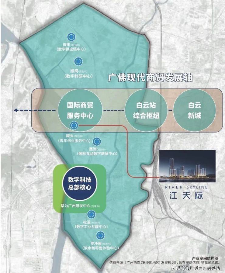 五矿招商江天际坐落于白云区湾区新岸(罗冲围)片区核心,紧邻槎头 TOD 综合体。根据《广州湾区新岸(罗冲围)片区发展规划》,该片区定位为 “白云区未来社会经济发展高热点区域、第二个珠江新城”,规划以 “统筹做地” 模式推进大规模城市改造,打造以华为为核心的智能汽车产业集群(数据来源:白云区政府官网)。