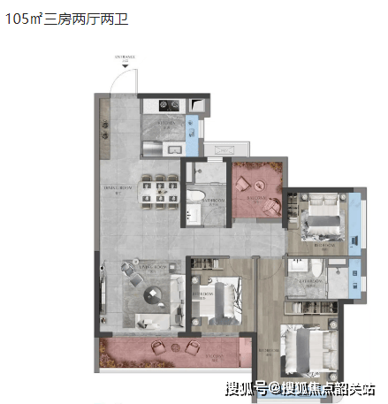 105㎡三房两厅两卫:紧凑高效,三房格局实用,适合年轻家庭;