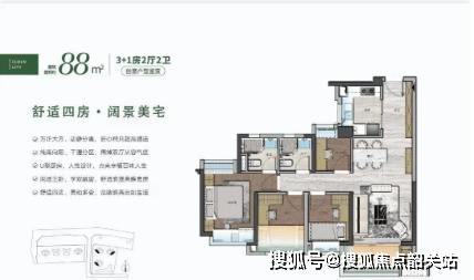 88㎡四房二卫户型:空间利用合理,四房设计可满足家庭不同成员的居住需求,双卫配置提升了居住的舒适度,适合人口稍多的刚需家庭。