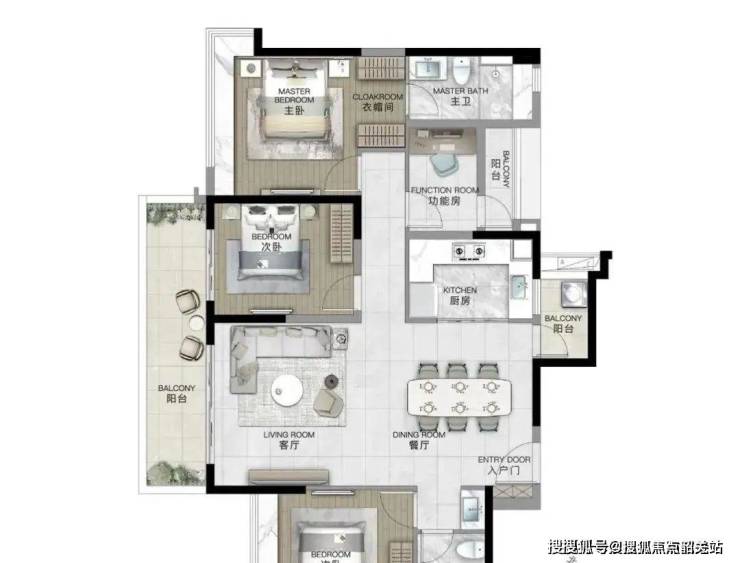 125平四房:横厅布局,配有宽敞的南向阳台,主卧同样享有270°观景大飘窗及超大衣帽间,非常适合追求生活品质的家庭。