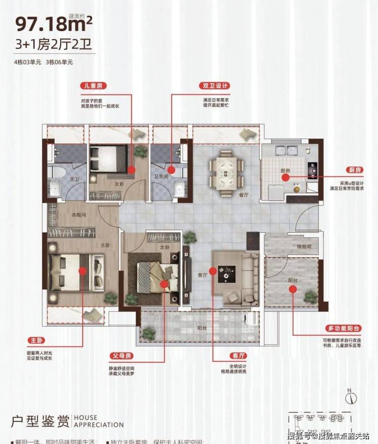 3座03/4座06户型:3+1房2厅2卫 建面约97㎡