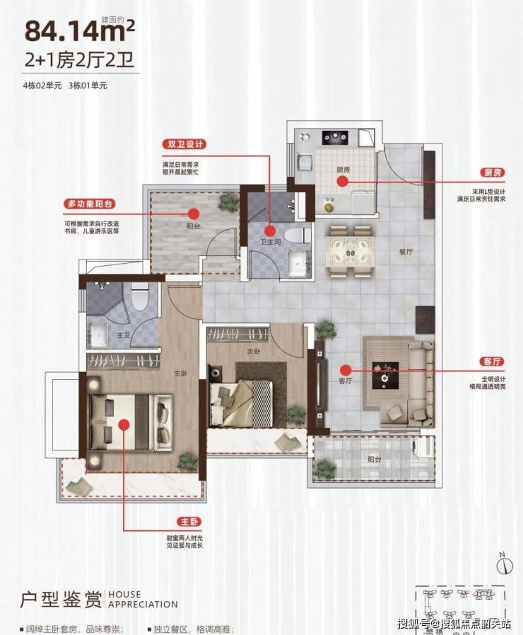 3座01/4座02户型:2+1房2厅2卫 建面约84㎡