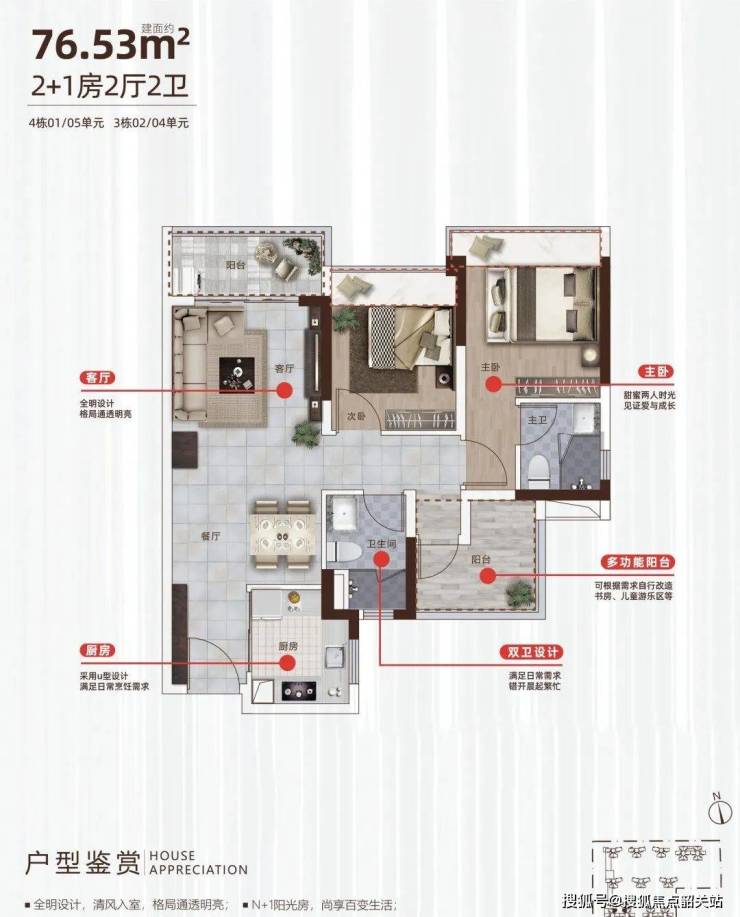 3座02、04、05/4座01、04、05户型:2+1房2厅2卫 建面约76㎡