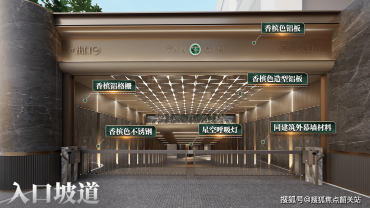 更难得的是,项目不惜牺牲可观的车位货值,在车库空间中罕见地打造了 “坡道玄关”。如同住宅玄关完成公共空间到私密空间的过渡,车行归家的坡道玄关,成为了隔绝都市喧嚣的缓冲带,让业主在下车的瞬间,便能完成从工作到生活、从纷扰到静谧的心境切换。坡道玄关同样以普拉达绿石材为基底,搭配香槟色铝板、镜面不锈钢等多元材质,地面以环氧水磨石铺陈社区专属纹样,让南洋海派的美学符号贯穿归家全链路。
