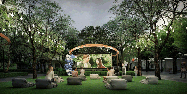 2026 年 3 月中旬,项目中轴公园的核心节点星空剧场正式开放,为业主的自然生活版图补上了至关重要的一块。这片被浓荫环绕的户外空间,白日里可以支起帐篷露营,铺开野餐垫享受慵懒的闲暇时光;夜幕降临后,又能化身为浪漫的露天影院,以星空为幕,以晚风为伴。未来,草坪音乐会、星空市集、邻里分享会等多元活动都将在这里轮番上演,为业主的日常增添更多美好与惊喜。