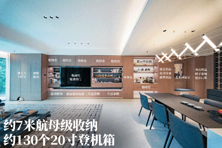 得益于新规优化与精准的空间设计,建面约 137/139㎡户型实用率超 100%,折算下来,户型实际到手的使用面积,比市面上同面积段的常规户型多出约一间主卧的空间。这份实打实的空间利用率,为改善家庭带来了更多生活场景的可能性,彻底告别了改善户型 “空间捉襟见肘” 的普遍痛点。以 137㎡户型为例,项目在空间中打造了航母级超大收纳电视墙,收纳容量相当于 130 个 20 寸行李箱,在巨量收纳设计的前提下,客厅空间依然保持阔绰明亮,实现了收纳与空间感的完美平衡。