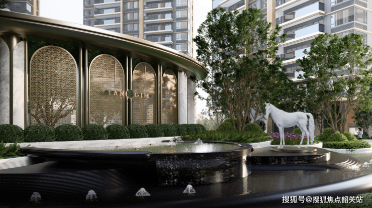 步入社区园林,最先迎面而来的是天珺系定制的白马雕塑,昂扬的身姿承载着对业主事业顺遂的美好祝愿,也祈愿小业主们学业有成、金榜题名。金樽映月屏风与跌级水景相映成趣,经典的拱券式屏风设计,将天珺专属纹样镶嵌于普拉达绿石材之中,以 “屏风藏富” 的巧思,营造出兼具仪式感与美感的入口景观。