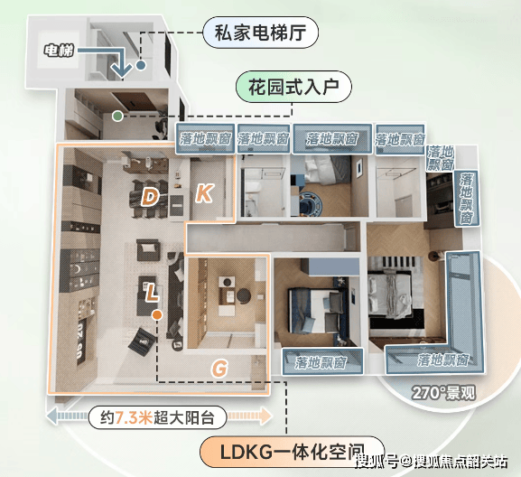第三是居住体验的升级,私梯入户设计实现了专属的入户空间,告别了传统户型的电梯厅公摊共享、邻里干扰的问题,提升了居住的私密性与尊崇感;LDK 一体化设计 + 超 7 米南向阳台,让公共活动空间更开阔,家庭互动、亲友社交的场景体验全面升级,实现了空间利用率与居住体验的双重提升。